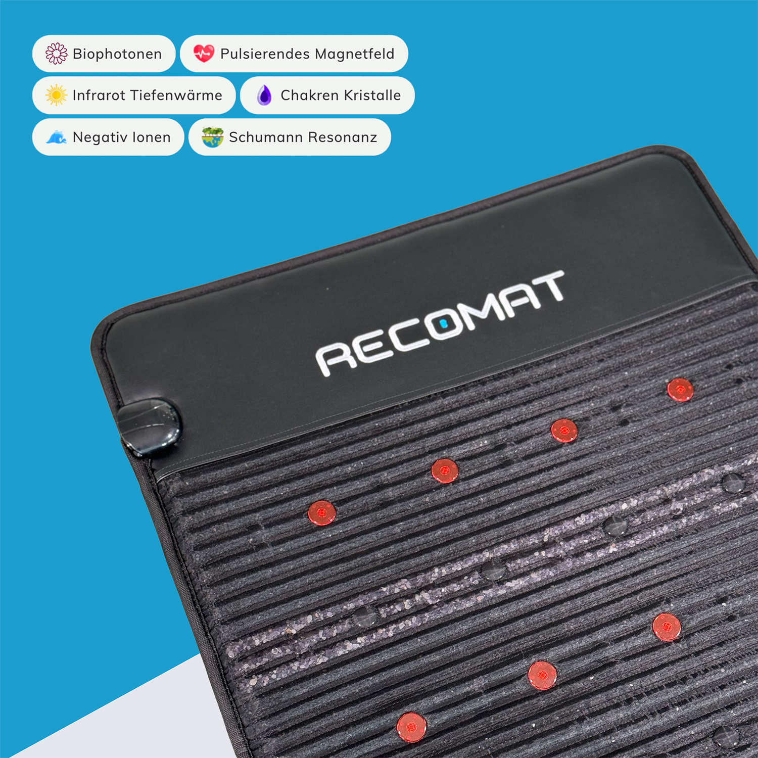 Die Recomat® Frequenz Matte vereint sorgfältig ausgewählte Edelsteine mit modernster Technologie, um Regeneration, Erdung und mentale Balance zu unterstützen: